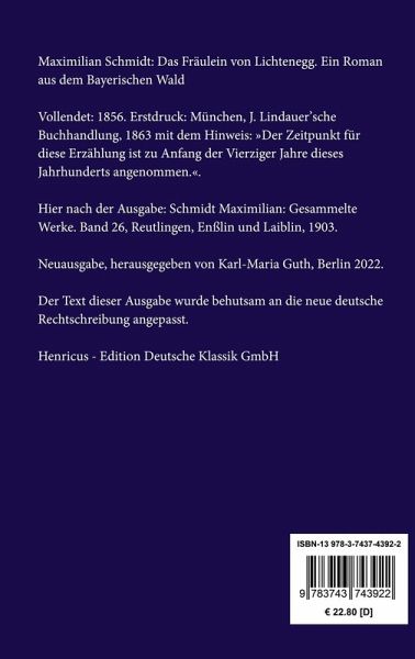 Maximilian Schmidt: Das Fräulein von Lichtenegg. Ein Roman aus dem Bayerischen WaldVollendet: 1856. Erstdruck: München, J. Lindauer'sche Buchhandlung, 1863 mit dem Hinweis: »Der Zeitpunkt für diese Erzählung ist zu Anfang der Vierziger Jahre dieses Jahrhunderts angenommen.«. Hier nach der Ausgabe: Schmidt Maximilian: Gesammelte Werke. Band 26, Reutlingen, Enßlin und Laiblin, 1903.Neuausgabe, herausgegeben von Karl-Maria Guth, Berlin 2023.Der Text dieser Ausgabe wurde behutsam an die neue deutsche Rechtschreibung angepasst.Umschlagabbildung: Edmund Leighton, Burgfräulein beim Nähen, 1911Gesetzt aus der Minion Pro, 11 pt.Die Sammlung Hofenberg erscheint im Verlag Henricus - Edition Deutsche Klassik GmbH, Berlin