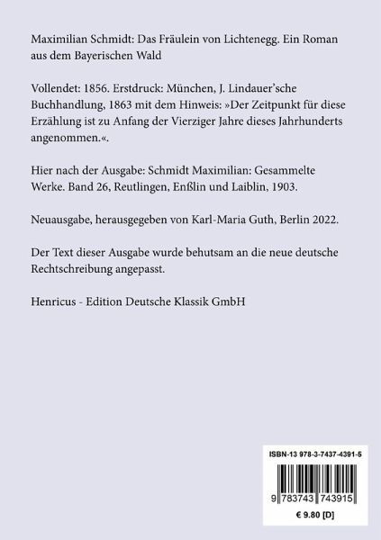 Maximilian Schmidt: Das Fräulein von Lichtenegg. Ein Roman aus dem Bayerischen WaldVollendet: 1856. Erstdruck: München, J. Lindauer'sche Buchhandlung, 1863 mit dem Hinweis: »Der Zeitpunkt für diese Erzählung ist zu Anfang der Vierziger Jahre dieses Jahrhunderts angenommen.«. Hier nach der Ausgabe: Schmidt Maximilian: Gesammelte Werke. Band 26, Reutlingen, Enßlin und Laiblin, 1903.Neuausgabe, herausgegeben von Karl-Maria Guth, Berlin 2023.Der Text dieser Ausgabe wurde behutsam an die neue deutsche Rechtschreibung angepasst.Umschlagabbildung: Edmund Leighton, Burgfräulein beim Nähen, 1911Gesetzt aus der Minion Pro, 11 pt.Die Sammlung Hofenberg erscheint im Verlag Henricus - Edition Deutsche Klassik GmbH, Berlin