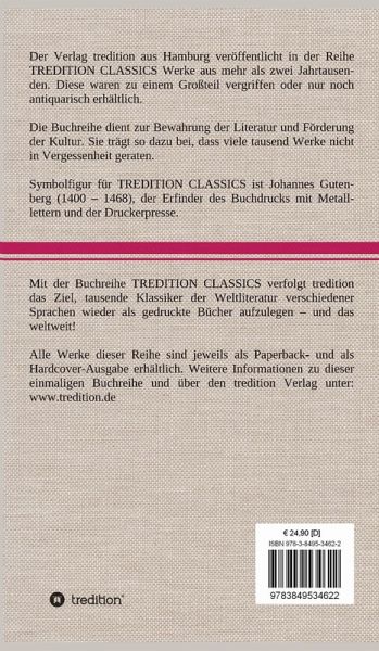 Diese Hardcover-Ausgabe ist Teil der TREDITION CLASSICS. Der Verlag tredition aus Hamburg veröffentlicht in der Buchreihe TREDITION CLASSICS Werke aus mehr als zwei Jahrtausenden. Diese waren zu einem Großteil vergriffen oder nur noch antiquarisch erhältlich. Mit TREDITION CLASSICS verfolgt tredition das Ziel, tausende Klassiker der Weltliteratur verschiedener Sprachen wieder als gedruckte Bücher zu verlegen und das weltweit! Die Buchreihe dient zur Bewahrung der Literatur und Förderung der Kultur. Sie trägt so dazu bei, dass viele tausend Werke nicht in Vergessenheit geraten.