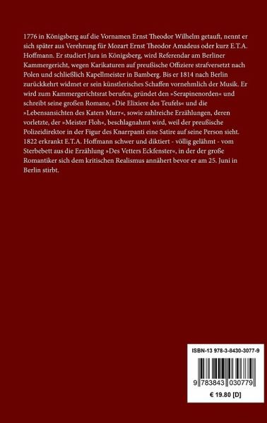 E. T. A. Hoffmann: Das Fräulein von Scuderi. Erzählung aus dem Zeitalter Ludwig des Vierzehnten Erstdruck in: Taschenbuch für das Jahr 1820, Frankfurt/M. 1819. Vollständige Neuausgabe mit einer Biographie des Autors. Herausgegeben von Karl-Maria Guth. Berlin 2015. Textgrundlage ist die Ausgabe: E.T.A. Hoffmann: Poetische Werke in sechs Bänden, Band 4, Berlin: Aufbau, 1963. Die Paginierung obiger Ausgabe wird in dieser Neuausgabe als Marginalie zeilengenau mitgeführt. Umschlaggestaltung von Thomas Schultz-Overhage unter Verwendung des Bildes: Unbekannter Künstler, Madame de Scudéry, 17. Jahrhundert. Gesetzt aus Minion Pro, 11 pt. Über den Autor: 1776 in Königsberg auf die Vornamen Ernst Theodor Wilhelm getauft, nennt er sich später aus Verehrung für Mozart Ernst Theodor Amadeus oder kurz E.T.A. Hoffmann. Er studiert Jura in Königsberg, wird Referendar am Berliner Kammergericht, wegen Karikaturen auf preußische Offiziere strafversetzt nach Polen und schließlich Kapellmeister in Bamberg. Bis er 1814 nach Berlin zurückkehrt widmet er sein künstlerisches Schaffen vornehmlich der Musik. Er wird zum Kammergerichtsrat berufen, gründet den »Serapinenorden« und schreibt seine großen Romane, »Die Elixiere des Teufels« und die »Lebensansichten des Katers Murr«, sowie zahlreiche Erzählungen, deren vorletzte, der »Meister Floh«, beschlagnahmt wird, weil der preußische Polizeidirektor in der Figur des Knarrpanti eine Satire auf seine Person sieht. 1822 erkrankt E.T.A. Hoffmann schwer und diktiert - völlig gelähmt - vom Sterbebett aus die Erzählung »Des Vetters Eckfenster«, in der der große Romantiker sich dem kritischen Realismus annähert bevor er am 25. Juni in Berlin stirbt.