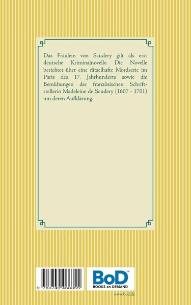 Das Fräulein von Scudery gilt als erst deutsche Kriminalnovelle. Die Novelle behandelt eine rätselhafte Mordserie im Paris des 17. Jahrhunderts sowie die Bemühungen der französischen Schriftstellerin Madeleine de Scudery (1607 - 1701) um deren Aufklärung.