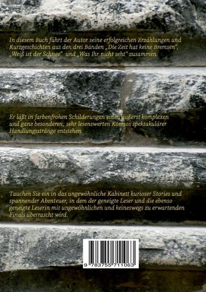 In diesem Buch bringt der Autor die erfolgreichsten Erzählungen und Kurzgeschichten aus seinen drei Bänden Die Zeit hat keine Bremsen, Weiß ist der Schnee und Was Ihr nicht seht zusammen. Er kreiert in farbenfrohen Schilderungen einen komplexen und ganz besonderen, sehr lesenswerten Kosmos spektakulärer Handlungsstränge. Tauchen Sie ein in das ungewöhnliche Kabinett seltsamer, kurioser Stories, launiger und spannender Abenteuer, in dem der geneigte Leser und die ebenso geneigte Leserin mit immer wieder ungewöhnlichen und nicht zu erwartenden Finals überrascht wird.