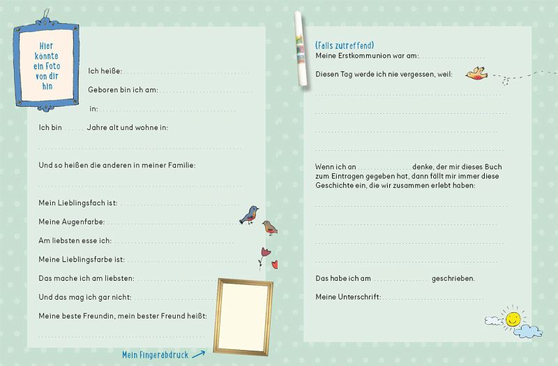 Freunde sind etwas Wunderbares! Doch in diesem Buch haben auch alle anderen Platz, die die Erstkommunion mitgefeiert und vorbereitet haben: die Familie, die Paten und anderen Gäste, die Kinder aus der Kommuniongruppe und die Katecheten - und einfach alle, die man mag. Und vielleicht erfährt man dann sogar noch etwas ganz Neues über seine Lieben, was man gar nicht wusste, bevor sie sich hier eingetragen haben!