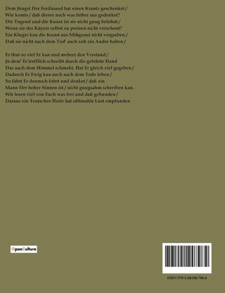 Dem Jüngst Der Ferdinand hat einen Krantz geschenket / Wie komts / daß dieser noch was höher aus gedenket? Die Tugend und die Kunst ist sie nicht gnug belohnt / Wenn sie der Käyser selbst zu preisen nicht verschont? Ein Kluger kan die Kunst aus Mißgunst nicht vergraben / Daß sie nicht nach dem Tod' auch solt ein Ander haben / Er thut so viel Er kan und mehret den Verstand / Jn dem' Er trefflich schreibt durch die gelehrte Hand Das nach dem Himmel schmekt. Hat Er gleich viel gegeben / Dadurch Er Ewig kan auch nach dem Tode leben / So fährt Er dennoch fohrt und denket / daß ein Mann Der hoher Sinnen ist / nicht gnugsahm schreiben kan. Wir lesen viel von Euch was frei und daß gebunden / Daraus ein Teutsches Hertz hat offtmahls Lust empfunden