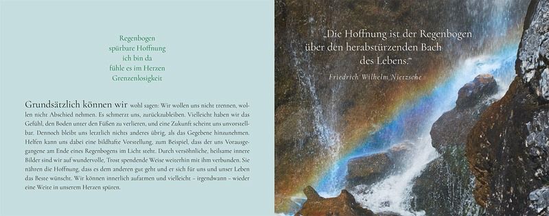 "Wenn ein geliebter Mensch von uns gegangen ist, so bleibt er doch Bestandteil unserer Welt - nicht nur in der Erinnerung. Wenn wir wollen, können wir ihn spüren, jetzt und überall: in jedem Sandkorn, in jedem Windhauch, in jedem Sonnenstrahl, im Duft jeder Blume, im Rauschen des Regens, im Funkeln der Sterne." (Holger Aurin)