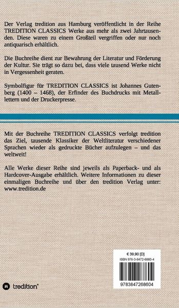 Diese Hardcover-Ausgabe ist Teil der TREDITION CLASSICS. Der Verlag tredition aus Hamburg veröffentlicht in der Buchreihe TREDITION CLASSICS Werke aus mehr als zwei Jahrtausenden. Diese waren zu einem Großteil vergriffen oder nur noch antiquarisch erhältlich. Mit TREDITION CLASSICS verfolgt tredition das Ziel, tausende Klassiker der Weltliteratur verschiedener Sprachen wieder als gedruckte Bücher zu verlegen und das weltweit! Die Buchreihe dient zur Bewahrung der Literatur und Förderung der Kultur. Sie trägt so dazu bei, dass viele tausend Werke nicht in Vergessenheit geraten.