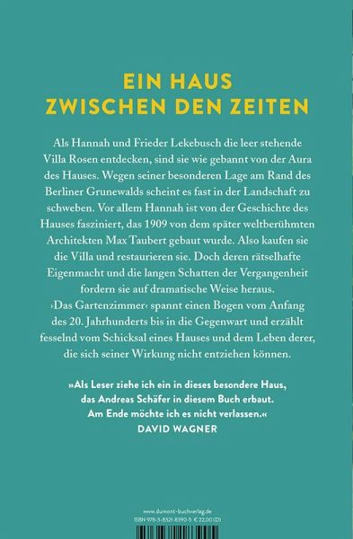 Die Villa Rosen, ein neoklassizistisches Landhaus, wird 1909 von dem später zu Weltruhm gelangenden Architekten Max Taubert für einen Professor Adam Rosen und seine Frau Elsa entworfen. Als Frieder und Hannah Lekebusch Mitte der Neunzigerjahre das leer stehende Haus am Rande des Berliner Grunewalds entdecken, erliegen sie seinem verwunschenen Charme. In einer aufwendigen Restaurierung stellen die Lekebuschs den Originalzustand des Hauses wieder her, und schnell wird die neu erstrahlende Dahlemer Villa als »Kleinod der Vormoderne« zum Pilgerort für Taubert-Fans, Künstler und einflussreiche Journalisten. Und - wie schon in der Weimarer Republik und zur NS-Zeit - zum Spielball der Interessen. Sie wollten den alten Geist des Hauses wiedererwecken, doch mit den Auswirkungen des Ruhms und dem langen Schatten der Vergangenheit haben die Lekebuschs nicht gerechnet.Kunst, Moral, privates Glück und Politik: 'Das Gartenzimmer' spannt einen Bogen von der Aufbruchsstimmung zu Beginn des 20. Jahrhunderts über die Weimarer Republik und die Herrschaft der Nationalsozialisten bis in die Gegenwart. Andreas Schäfer erzählt klug, feinfühlig und fesselnd vom Schicksal eines Hauses in Berlin-Dahlem und dem Leben derer, die sich seiner sirenenhaften Wirkung nicht entziehen können.»Als Leser ziehe ich ein in dieses besondere Haus, das Andreas Schäfer in diesem Buch erbaut. Am Ende möchte ich es nicht verlassen.« David Wagner»Andreas Schäfer ist der Meister des Subtilen. Er variiert, bis wir merken, dass wir uns längst mit etwas beschäftigen, das über den Raum des Romans hinausweist: mitten hinein ins Leben.« WDR 5