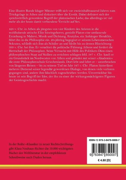 In der Reihe »Klassiker in neuer Rechtschreibung« gibt Klara Neuhaus-Richter die wichtigsten Bücher der Weltliteratur in der empfohlenen Schreibweise nach Duden heraus. Platon: Das Gastmahl. Symposion Eine illustre Runde kluger Männer trifft sich vor zweieinhalbtausend Jahren zum Trinkgelage in Athen und diskutiert über die Erotik. Dabei definiert sich der sprichwörtlich gewordene Begriff der platonischen Liebe; das allerdings ist viel mehr als der heute damit verbundene Verzicht auf Sex. Symposion. Entstanden etwa um 380 v. Chr. Erstdruck (in lateinischer Übersetzung durch Marsilio Ficino) in: Opera, Florenz o. J. (ca. 1482/84). Erstdruck des griechischen Originals in: Ha panta ta tu Platônos, herausgegeben von M. Musoros, Venedig 1513. Erste deutsche Übersetzung durch J. G. Schultheß unter dem Titel »Gastmahl oder Gespräch von der Liebe«, Zürich 1782. Auch erschienen unter dem Titel »Das Trinkgelage«. Der Text folgt der Übersetzung durch Franz Susemihl von 1855. Textgrundlage ist die Ausgabe: Platon: Sämtliche Werke. Berlin: Lambert Schneider, [1940]. Die Paginierung obiger Ausgabe wird in dieser Neuausgabe als Marginalie zeilengenau mitgeführt. Neu herausgegeben und mit einer Biografie des Autors versehen von Klara Neuhaus-Richter, Berlin 2021. Umschlaggestaltung von Rainer Richter unter Verwendung einer Porträtzeichnung von Josefine Weinschrott. Gesetzt aus der Minion Pro, 11 pt. Henricus - Edition Deutsche Klassik GmbH Über den Autor: 428 v. Chr. in Athen als jüngstes von vier Kindern des Ariston in die wohlhabende attische Elite hineingeboren, genießt Platon eine umfassende Erziehung in Malerei, Musik und Dichtung. Kratylos, ein Anhänger Heraklits, führt ihn in die Philosophie ein. 20-jähring begegnet er seinem Lebensmenschen Sokrates, schließt sich ihm als Schüler an und bleibt bis zu dessen Hinrichtung 399 v. Chr. bei ihm. Er verachtet die politische Führung Athens und fordert die Herrschaft der Philosophen. Seine Versuche mit Hilfe des Politikers Dion einen philosophischen Staat auf Sizilien zu errichten schlagen fehl. 387 v. Chr. kauft er ein Grundstück im Nordwesten von Athen und gründet mit seiner »Akademie« die erste Philosophenschule Griechenlands. Dort lebt und lehrt er ¿ unterbrochen von längeren Reisen ¿ bis zu seinem Tod im Jahr 347 v. Chr. Platon hinterlässt mehrere Dutzend seiner legendär gewordenen Dialoge, von denen viele verloren gegangen sind, andere ihm fälschlich zugeschrieben werden. Unverrückbar bis heute ist sein Begriff der Idee, der ihn zu einer der wirkungsmächtigsten Figuren der Geistesgeschichte macht.