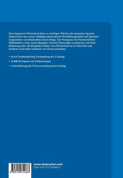 Das Gegenwort-Wörterbuch listet zu wichtigen Wörtern der deutschen Sprache Gegenwörter auf, nennt vielfältige antonymische Wortbildungsmittel und illustriert Gegenwörter verschiedentlich durch Belege. Die Wortpaare wie Festnetztelefon/Mobiltelefon, Cyber money/Bargeld, Matrixsatz/Konstituentensatz, werden kurz mit ihrer Bedeutung oder mit Beispielen erklärt. Das Wörterbuch ist in Unterricht und Studium sowie beim Verfassen von Texten einsetzbar.