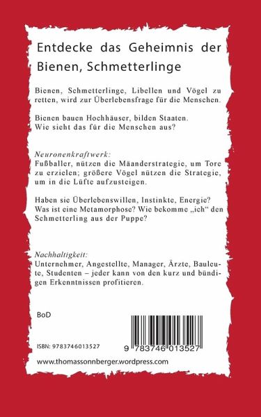 Entdecke das Geheimnis der Bienen, SchmetterlingeBienen, Schmetterlinge und Vögel zu retten, wird zur Überlebensfrage für die Menschen.Bienen bauen Hochhäuser, bilden Staaten. Vögel sind soziale Wesen. Wespen bauen Wohnungen.Wie sieht es mit den Menschen aus?Neuronenkraftwerk: Fußballer, nützen die Mäanderstrategie, um Tore zu erzielen; größere Vögel nützen sie, um in die Lüfte aufzusteigen.Haben sie Überlebenswillen, Instinkte, Energie?Nachhaltigkeit:Unternehmer, Angestellte, Manager, Ärzte, Bauleute, Studenten, jeder kann von den kurz und bündigen Erkenntnissen profitieren.