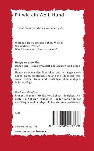 Selbstorganisierende Er- und Beziehung der Tiere.... sind Schätze, die es zu heben gilt. Wie funktioniert die selbstorganisierende Er- und Beziehung der Tiere? Wie bekomme ich unkontrolliertes Bellen, Anspringen, Beißen in den Griff?Wie kann man Schafe vor Wölfen schützen?Was ist rechtlich bei Tieren, wie Hund, Katze und Wölfen, zu beachten? DankeDurch die pendelartige und fasziengerechte Bewegung der Tiere, insbesondere der Hunde, lernte ich wieder genetisch, richtiges Gehen. Die unbezahlbare Lebensqualität, die ich heute habe, verdanke ich den Hunden.Buch mit Rendite: Frauen, Männer, Mediziner, Lehrer, Erzieher, Angestellte, jeder kann von den vielfältigen und bündigen Erkenntnissen profitieren. www.thomassonnberger.at