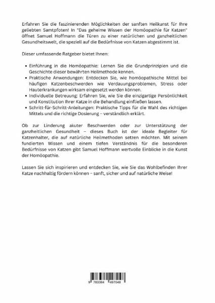 Erfahren Sie die faszinierenden Möglichkeiten der sanften Heilkunst für Ihre geliebten Samtpfoten! In "Das geheime Wissen der Homöopathie für Katzen" öffnet Samuel Hoffmann die Türen zu einer natürlichen und ganzheitlichen Gesundheitswelt, die speziell auf die Bedürfnisse von Katzen abgestimmt ist.Dieser umfassende Ratgeber bietet Ihnen:Einführung in die Homöopathie: Lernen Sie die Grundprinzipien und die Geschichte dieser bewährten Heilmethode kennen.Praktische Anwendungen: Entdecken Sie, wie homöopathische Mittel bei häufigen Katzenbeschwerden wie Verdauungsproblemen, Stress oder Hauterkrankungen wirksam eingesetzt werden können.Individuelle Betreuung: Erfahren Sie, wie Sie die einzigartige Persönlichkeit und Konstitution Ihrer Katze in die Behandlung einfließen lassen.Schritt-für-Schritt-Anleitungen: Praktische Tipps für die Wahl des richtigen Mittels und die richtige Dosierung - verständlich erklärt.Ob zur Linderung akuter Beschwerden oder zur Unterstützung der ganzheitlichenGesundheit - dieses Buch ist der ideale Begleiter für Katzenhalter, die auf natürliche Heilmethoden setzen möchten. Mit seinem fundierten Wissen und einem tiefen Verständnis für die besonderen Bedürfnisse von Katzen gibt Samuel Hoffmann wertvolle Einblicke in die Kunst der Homöopathie.Lassen Sie sich inspirieren und entdecken Sie, wie Sie das Wohlbefinden Ihrer Katze nachhaltig fördern können - sanft, sicher und auf natürliche Weise!