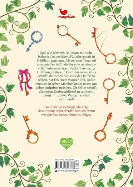 Egal wie sehr sich Feli etwas wünscht, bisher ist keiner ihrer Wünsche jemals in Erfüllung gegangen. Als sie eines Tages auf eine gute Fee trifft, die ihr eine geheimnisvolle Truhe anvertraut, flackert ein wenig Hoffnung in ihr auf. Doch nur wenn sie es schafft, die sieben Schlösser der Truhe zu öffnen, hat Feli einen Wunsch frei. Dafür muss sie in sieben Märchenländer reisen und sieben Aufgaben meistern, um die passenden Schlüssel zu finden. Ob Feli es schafft, alle sieben Zauberschlüssel zu sammeln, damit ihr größter Wunsch endlich wahr wird?