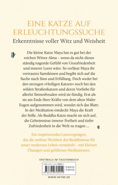 Eigentlich geht es der kleinen Katze Maya gut - wäre da nicht dieses ständig nagende Gefühl von Unzufriedenheit und innerer Leere. Deshalb verlässt Maya ihr vertrautes Samtkissen und begibt sich auf die Suche nach Sinn und Erfüllung. Doch weder bei den strengen »Heiligen Katzen«, noch bei den wilden Straßenkatzen und deren Vorliebe für allerlei Sinnesfreuden wird sie fündig. Erst als sie am Ende ihrer Kräfte von dem alten Maler Eugen aufgenommen wird, wendet sich das Blatt: In der Meditation entdeckt Maya die Kraft der Stille. Als Buddha-Katze macht sie sich auf, die Geheimnisse innerer Freiheit und tiefer Zufriedenheit in die Welt zu tragen ...