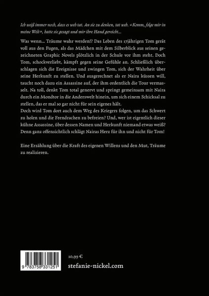 Ich weiß immer noch, dass es weh tat. An sie zu denken, tat weh. "Komm, folge mir in meine Welt", hatte sie gesagt und mir ihre Hand gereicht...Was wenn... Träume wahr werden!? Das Leben des 17jährigen Tom gerät voll aus den Fugen, als das Mädchen mit dem Silberblick aus seinen gezeichneten Graphic Novels plötzlich in der Schule vor ihm steht. Doch Tom, schockverliebt, kämpft gegen seine Gefühle an. Schließlich überschlagen sich die Ereignisse und zwingen Tom, sich der Wahrheit über seine Herkunft zu stellen. Und ausgerechnet als er Naira küssen will, taucht noch dazu ein Assassine auf, der ihm ordentlich die Tour vermasselt. Na toll, denkt Tom total genervt und springt gemeinsam mit Naira durch ein Mondtor in die Anderswelt hinein, um sich einem Schicksal zu stellen, das er mal so gar nicht für sein eigenes hält. Doch wird Tom dort auch dem Weg des Kriegers folgen, um das Schwert zu holen und die Feendrachen zu befreien? Und, wer ist eigentlich dieser kühne Assassine, über dessen Namen und Herkunft niemand etwas weiß? Denn ganz offensichtlich schlägt Nairas Herz für ihn und nicht für Tom!