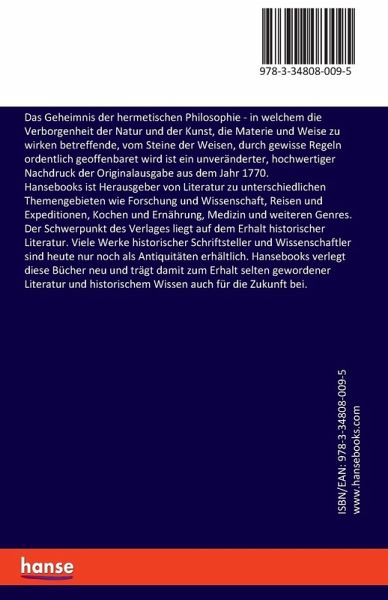 Das Geheimnis der hermetischen Philosophie - in welchem die Verborgenheit der Natur und der Kunst, die Materie und Weise zu wirken betreffende, vom Steine der Weisen, durch gewisse Regeln ordentlich geoffenbaret wird ist ein unveränderter, hochwertiger Nachdruck der Originalausgabe aus dem Jahr 1770.Hansebooks ist Herausgeber von Literatur zu unterschiedlichen Themengebieten wie Forschung und Wissenschaft, Reisen und Expeditionen, Kochen und Ernährung, Medizin und weiteren Genres. Der Schwerpunkt des Verlages liegt auf dem Erhalt historischer Literatur. Viele Werke historischer Schriftsteller und Wissenschaftler sind heute nur noch als Antiquitäten erhältlich. Hansebooks verlegt diese Bücher neu und trägt damit zum Erhalt selten gewordener Literatur und historischem Wissen auch für die Zukunft bei.