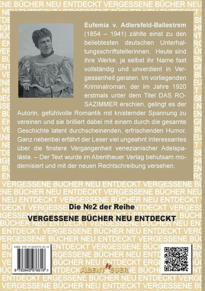 Eufemia von Adlersfeld-Ballestrem (1854 - 1941) zählte einst zu den beliebtesten deutschen Unterhaltungsschriftstellerinnen. Heute sind ihre Werke, ja selbst ihr Name fast vollständig und unverdient in Vergessenheit geraten. Im vorliegenden Kriminalroman, der im Jahre 1920 erstmals unter dem Titel DAS ROSAZIMMER erschien, gelingt es der Autorin meisterhaft, gefühlvolle Romantik mit knisternder Spannung zu vereinen und sie brilliert dabei mit einem durch die gesamte Geschichte latent durchscheinenden, erfrischenden Humor. Ganz nebenbei erfährt der Leser viel ungeahnt Interessantes über die finstere Vergangenheit venezianischer Adelspaläste. - Der Text wurde im Abentheuer Verlag behutsam modernisiert und mit der neuen Rechtschreibung versehen.