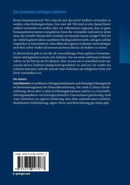 In diesem Buch geht es um die oft vernachlässigte Basis jeglicher Kommunikation und jeglichen Lernens: das Zuhören. Das wir mehr und besser Zuhören sollten, ist im Prinzip ein No-Brainer. Aber warum wir es tatsächlich nicht tun, warum aktives Zuhören häufig kontraproduktiv ist und wie wir wieder ins Zuhören kommen, stellt die Autorin Anja Niekerken aus alltäglicher Sicht und leicht verständlich vor.