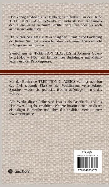 Diese Hardcover-Ausgabe ist Teil der TREDITION CLASSICS. Der Verlag tredition aus Hamburg veröffentlicht in der Buchreihe TREDITION CLASSICS Werke aus mehr als zwei Jahrtausenden. Diese waren zu einem Großteil vergriffen oder nur noch antiquarisch erhältlich. Mit TREDITION CLASSICS verfolgt tredition das Ziel, tausende Klassiker der Weltliteratur verschiedener Sprachen wieder als gedruckte Bücher zu verlegen und das weltweit! Die Buchreihe dient zur Bewahrung der Literatur und Förderung der Kultur. Sie trägt so dazu bei, dass viele tausend Werke nicht in Vergessenheit geraten.
