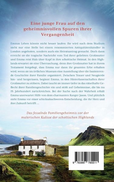 Eine junge Frau auf den geheimnisvollen Spuren ihrer Vergangenheit … Das fesselnde Familiengeheimnis vor der malerischen Kulisse der schottischen Highlands Emmas Leben könnte nicht besser laufen: Ihr wird nach dem Studium nicht nur eine Stelle bei einem renommierten Antiquitätenhändler in London angeboten, sondern auch ein Heiratsantrag gemacht. Doch dann erreicht sie die tragische Nachricht vom Tod ihrer geliebten Großmutter und Emma reist Hals über Kopf in ihre schottische Heimat. In den Highlands erwartet sie eine Überraschung, denn ihre Großmutter hat in ihrem Testament festgelegt, dass Emma nur dann ihr gesamtes Erbe erhalten wird, wenn sie im örtlichen Museum eine Ausstellung über die faszinierende Geschichte ihrer Familie organisiert. Zwischen Trauer und Neugierde hin- und hergerissen, beginnt Emma, in den Hinterlassenschaften ihrer Großmutter zu stöbern. Dabei taucht sie immer tiefer in das rätselhafte Geflecht ihrer Familiengeschichte ein und stößt auf Geheimnisse, die bis ins 19. Jahrhundert zurückreichen. Bei der Suche nach der Wahrheit erhält Emma unerwartet Hilfe von dem charmanten Ranger Jason. Und plötzlich steht Emma vor einer schicksalsschweren Entscheidung, die ihr Herz und ihre Zukunft betrifft … Dies ist eine überarbeitete Neuausgabe des bereits erschienenen Titels Schicksal in den Highlands. Erste Leser:innenstimmen „Liebenswerter Roman für alle Fans von Familiengeheimnissen." „Mitreißend, romantisch, bewegend und nur zu empfehlen!" „Habe mich schnell gefühlt, als wäre ich selbst in den Highlands, so sehr hat mich das Ebook in den Bann gezogen." „Liebesroman mit Spannung, Herz und authentischen Charakteren!"