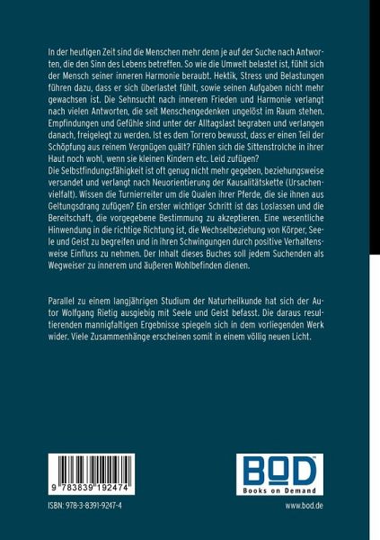 In der heutigen Zeit sind die Menschen mehr denn je auf der Suche nach Antworten, die den Sinn des Lebens betreffen. So wie die Umwelt belastet ist, fühlt sich der Mensch seiner inneren Harmonie beraubt. Hektik, Stress und Belastungen führen dazu, dass er sich überlastet fühlt, sowie seinen Aufgaben nicht mehr gewachsen ist. Die Sehnsucht nach innerem Frieden und Harmonie verlangt nach vielen Antworten, die seit Menschengedenken ungelöst im Raum stehen. Empfindungen und Gefühle sind unter der Alltagslast begraben und verlangen danach, freigelegt zu werden. Ist es dem Torrero bewusst, dass er einen Teil der Schöpfung aus reinem Vergnügen quält? Fühlen sich die Sittenstrolche in ihrer Haut noch wohl, wenn sie kleinen Kindern etc. Leid zufügen?Die Selbstfindungsfähigkeit ist oft genug nicht mehr gegeben, beziehungsweise versandet und verlangt nach Neuorientierung der Kausalitätskette (Ursachenvielfalt). Wissen die Turnierreiter um die Qualen ihrer Pferde, die sie ihnen aus Geltungsdrang zufügen? Ein erster wichtiger Schritt ist das Loslassen und die Bereitschaft, die vorgegebene Bestimmung zu akzeptieren. Eine wesentliche Hinwendung in die richtige Richtung ist, die Wechselbeziehung von Körper-Seele und Geist zu begreifen und in ihren Schwingungen durch positive Verhaltensweise Einfluss zu nehmen. Der Inhalt dieses Buches soll jedem Suchenden als Wegweiser zu innerem und äußeren Wohlbefinden dienen.
