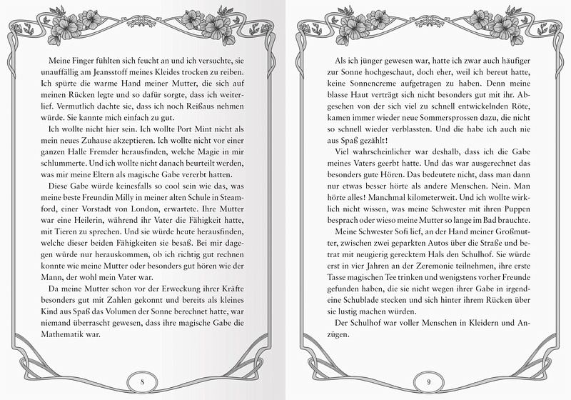 Die Idee des Buches fand ich toll. Mal was ganz Neues. Dazu ist das Buch noch eine echte Schönheit, außen wie innen, und macht neugierig auf den Inhalt. Das Cover setzt den Tee, der eine große Rolle spielt, perfekt in Szene und auf den Seiten finden sich verspielte Rahmen mit Pflanzenmotiven und am Kapitelanfang jeweils ein Bild. Auch zwischendrin werden die Abschnitte hin und wieder von einer Teetasse aufgelockert. Die Optik ist wunderbar und man möchte sich einfach mit einem Tee in den Sessel kuscheln und lesen. Der Einstieg gelingt ganz leicht, denn man kann sofort mit der Protagonistin Robin mitfühlen, die gerade erst neu in der Stadt sofort und ohne Freundin zum First Flush muss, wo jeder sie beobachten kann, wenn sie herausfindet, ob sie die Magie ihrer Mutter oder ihres Vaters geerbt hat. Letzterer hat die Familie vor Jahren verlassen und Robin weiß nichts über ihn. Der Abend läuft dann auch ganz anders und sehr überraschend ab. Mit der unerwarteten Fähigkeit kehrt bei Ro die Angst ein, denn niemand darf ihre wahre Fähigkeit erfahren. Doch wie soll sie die in der Teestunde, dem Magieunterricht, geheimhalten? Das sorgt für Spannung.