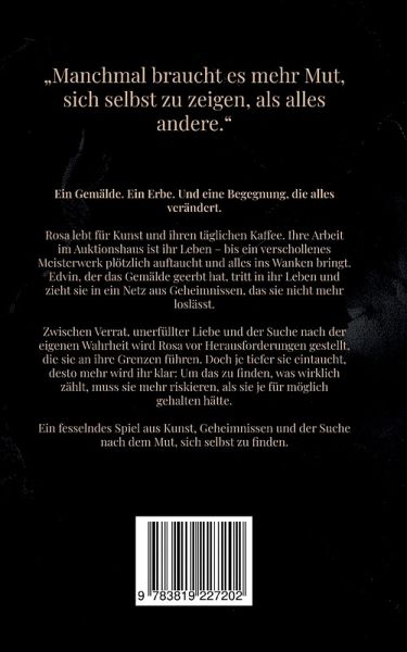 "Manchmal braucht es mehr Mut, sich selbst zu zeigen, als alles andere." Ein Gemälde. Ein Erbe. Und eine Begegnung, die alles verändert. Rose lebt für die Kunst und ihren täglichen Kaffee. Ihre Arbeit im Auktionshaus ist ihr Leben - bis ein verschollenes Meisterwerk plötzlich auftaucht und alles in Wanken bringt. Edvin, der das Gemälde geerbt hat, tritt in ihr Leben und zieht sie in ein Netz aus Geheimnissen, das sie nicht mehr loslässt. Zwischen Verrat, unerfüllter Liebe und der Suche der eigenen Wahrheit wird Rose vor Herausforderungen gestellt, die sie an ihre Grenzen führen. Doch je tiefer sie eintaucht, desto mehr wird ihr klar: Um das zu finden, was wirklich zählt, muss sie mehr riskieren, als sie je für möglich gehalten hätte. Ein fesselndes Spiel aus Kunst, Geheimnissen und der Suche nach dem Mut, sich selbst zu finden.