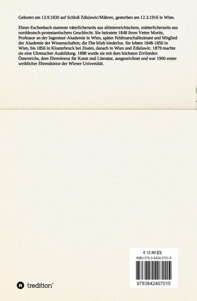 Geboren am 13.9.1830 auf Schloß Zdislawic/Mähren, gestorben am 12.3.1916 in Wien. Ebner-Eschenbach stammte väterlicherseits aus altösterreichischem, mütterlicherseits aus norddeutsch-protestantischem Geschlecht. Sie heiratete 1848 ihren Vetter Moritz, Professor an der Ingenieur-Akademie in Wien, später Feldmarschalleutnant und Mitglied der Akademie der Wissenschaften; die Ehe blieb kinderlos. Sie lebten 1848-1850 in Wien, bis 1856 in Klosterbruck bei Znaim, danach in Wien und Zdislawic. 1879 machte sie eine Uhrmacher-Ausbildung. 1898 wurde sie mit dem höchsten Zivilorden Österreichs, dem Ehrenkreuz für Kunst und Literatur, ausgezeichnet und war 1900 erster weiblicher Ehrendoktor der Wiener Universität.