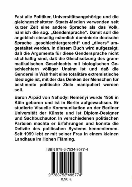 Fast alle Politiker, Universitätsangehörige und die gleichgeschalteten Staats-Medien verwenden seit kurzer Zeit eine andere Sprache als das Volk, nämlich die sog. "Gendersprache". Damit soll die angeblich einseitig männlich dominierte deutsche Sprache "geschlechtergerecht" und "divers" umgestaltet werden. In diesem Buch wird aufgezeigt, daß die Argumente für diese Gendersprache nicht stichhaltig sind, daß die Gleichsetzung des grammatikalischen Geschlechts mit biologischen Geschlechtern völliger Unsinn ist und daß die Genderei in Wahrheit eine totalitäre extremistische Ideologie ist, mit der das Denken der Menschen für bestimmte politische Ziele manipuliert werden soll.