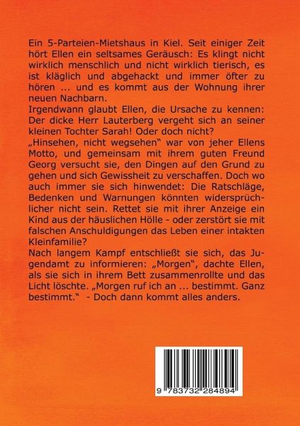 Ein 5-Parteien-Mietshaus in Kiel. Seit einiger Zeit hört Ellen ein seltsames Geräusch: Es klingt nicht wirklich menschlich und nicht wirklich tierisch, es ist kläglich und abgehackt und immer öfter zu hören ... und es kommt aus der Wohnung ihrer neuen Nachbarn.Irgendwann glaubt Ellen, die Ursache zu kennen: Der dicke Herr Lauterberg vergeht sich an seiner kleinen Tochter Sarah! Oder doch nicht? "Hinsehen, nicht wegsehen" war von jeher Ellens Motto, und gemeinsam mit ihrem guten Freund Georg versucht sie, den Dingen auf den Grund zu gehen und sich Gewissheit zu verschaffen. Doch wo auch immer sie sich hinwendet: Die Ratschläge, Bedenken und Warnungen könnten widersprüchlicher nicht sein. Rettet sie mit ihrer Anzeige ein Kind aus der häuslichen Hölle - oder zerstört sie mit falschen Anschuldigungen das Leben einer intakten Kleinfamilie? Nach langem Kampf entschließt sie sich, das Jugendamt zu informieren: "Morgen", dachte Ellen, als sie sich in ihrem Bett zusammenrollte und das Licht löschte. "Morgen ruf ich an ... bestimmt. Ganz bestimmt." - Doch dann kommt alles anders.