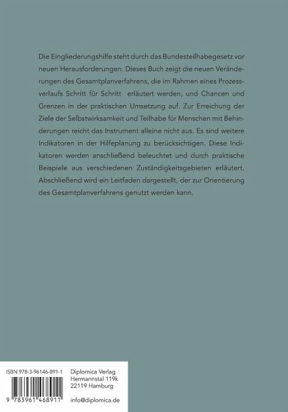 Die Eingliederungshilfe steht durch das Bundesteilhabegesetz vor neuen Herausforderungen. Dieses Buch zeigt die neuen Veränderungen des Gesamtplanverfahrens, die im Rahmen eines Prozessverlaufs Schritt für Schritt erläutert werden, und Chancen und Grenzen in der praktischen Umsetzung auf. Zur Erreichung der Ziele der Selbstwirksamkeit und Teilhabe für Menschen mit Behinderungen reicht das Instrument alleine nicht aus. Es sind weitere Indikatoren in der Hilfeplanung zu berücksichtigen. Diese Indikatoren werden anschließend beleuchtet und durch praktische Beispiele aus verschiedenen Zuständigkeitsgebieten erläutert. Abschließend wird ein Leitfaden dargestellt, der zur Orientierung des Gesamtplanverfahrens genutzt werden kann.
