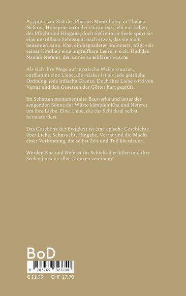 Ägypten, zur Zeit des Pharaos Mentuhotep in Theben. Neferet, Hohepriesterin der Göttin Isis, lebt ein Leben der Pflicht und Hingabe, doch tief in ihrer Seele spürt sie eine unstillbare Sehnsucht nach etwas, das sie nicht benennen kann. Kha, ein begnadeter Steinmetz, trägt seit seiner Kindheit eine ungreifbare Leere in sich. Und den Namen Neferet, den er nie zu erklären wusste. Als ihre Wege sich auf mystische Weise kreuzen, entflammt eine Liebe, die stärker ist als jede göttliche Ordnung, jede irdische Grenze. Doch ihre Liebe wird von Verrat und den Gesetzen der Götter hart geprüft. Im Schatten monumentaler Bauwerke und unter der sengenden Sonne der Wüste kämpfen Neferet und Kha um ihre Liebe. Eine Liebe, die das Schicksal selbst herausfordert. Das Geschenk der Ewigkeit ist eine epische Geschichte über Liebe, Sehnsucht, Hingabe, Verrat und die Macht einer Verbindung, die selbst Zeit und Tod überdauert. Werden Neferet und Kha ihr Schicksal erfüllen und ihre Seelen jenseits aller Grenzen vereinen?