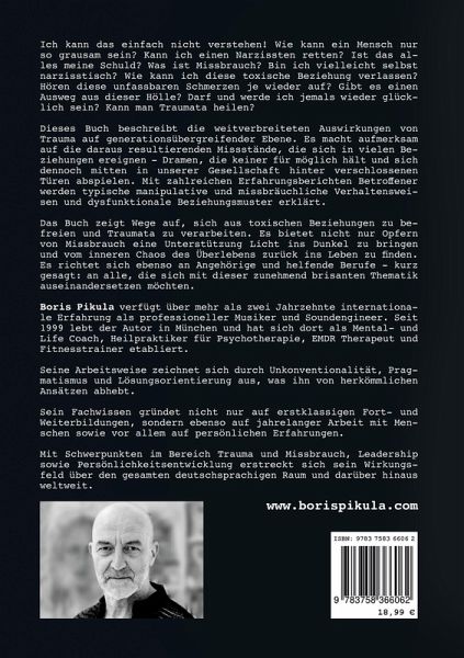 Frei von toxischen Beziehungen - Wege zur Heilung und zu neuem Lebensglück entdeckenIch kann das einfach nicht verstehen! Wie kann ein Mensch nur so grausam sein? Kann ich einen Narzissten retten? Ist das alles meine Schuld? Was ist Missbrauch? Bin ich vielleicht selbst narzisstisch? Wie kann ich diese toxische Beziehung verlassen? Hören diese unfassbaren Schmerzen je wieder auf? Gibt es einen Ausweg aus dieser Hölle? Darf und werde ich jemals wieder glücklich sein? Kann man Traumata heilen?Dieses Buch beschreibt die weitverbreiteten Auswirkungen von Trauma auf generationsübergreifender Ebene. Es macht aufmerksam auf die daraus resultierenden Missstände, die sich in vielen Beziehungen ereignen - Dramen, die keiner für möglich hält und die sich dennoch mitten in unserer Gesellschaft hinter verschlossenen Türen abspielen. Mit zahlreichen Erfahrungsberichten Betroffener werden typische manipulative Verhaltensweisen und dysfunktionale Beziehungsmuster erklärt.Das Buch zeigt Wege auf,sich aus toxischen Beziehungen zu befreien und Traumata zu verarbeiten. Es bietet nicht nur Opfern von Missbrauch eine Unterstützung, Licht ins Dunkel zu bringen und vom inneren Chaos des Überlebens zurück ins Leben zu finden. Es richtet sich ebenso an Angehörige und helfende Berufe - kurz gesagt: an alle, die sich mit dieser zunehmend brisanten Thematik auseinandersetzen möchten.Das Buch ist in drei Hauptabschnitte gegliedert, die den Leser auf verständliche, informative und gleichzeitig unverblümte Weise vom Verstehen, über das Annehmen, hin zu Heilungsmöglichkeiten führen:- Die Anatomie von Manipulation und Missbrauch- Die toxische Beziehung- Vom Überleben zurück ins Leben