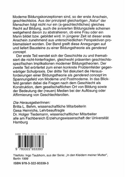Moderne Bildungskonzeptionen sind, so der erste Anschein, geschlechtslos. Aus der prinzipiell gleichartigen "Natur" der Menschen folgt nicht nur ein (a-geschlechtliches) gleiches Recht auf Bildung, auch die avisierten Bildungsziele scheinen weitgehend davon zu abstrahieren, ob eine Frau oder ein Mann bildet bzw. gebildet wird. In jüngerer Zeit ist dieser erste Anschein zunehmend aus unterschiedlichen Perspektiven problematisiert worden. Der Band greift diese Anregungen auf und liefert Bausteine zu einer Bildungstheorie als gendered concept.