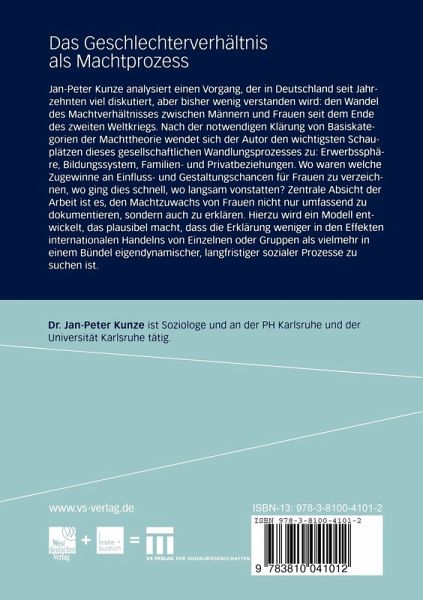 I. Problemstellung, methodisch-theoretische Verortung, Vorschau.- 1. Vorbemerkung: Frauen, Männer, Medien, Macht.- 2. Die Problemstellung.- 2.1 Das Problem.- 2.2 Der Stand der Problembearbeitung.- 2.3 Die verbleibende Aufgabe.- 3. Methodische Zugänge zum Wandel: "Normenkontrollverfahren" vs. klassische Methodik.- 4. Vorschau.- II. Der Lösungsansatz.- 1. Theoretische Ansätze und zentrale Begriffe bei Elias.- 1 1 Elias' Machtbegriff im Kontext seines Denkansatzes.- 1.2 Theoretische Bezüge und Stellenwert des Eliasschen Machtbegriffs.- 2. Operationalisierung.- 2.1 Analysefokus und Operationalisierungsweg.- 2.2 Basissatz der wirksamsten Machtmittel.- 2.3 Erweiterung des Basissatzes der Machtmittel mit Elias.- III. Ein exemplarischer Lösungsversuch: Machtwandlungen als Figurationsprozesse.- A. Machtbalance und machtrelevante.- Figurationsaspekte.- 1. Die unmittelbare Nachkriegszeit.- 1.1 Modifikation der Fragestellung und Operationalisierung.- 1.2 Veränderungen der Machtmittel.- 1.3 Veränderungen der Machtpositionen.- 1.4 Die familiale Machtbalance.- 1.5 Zwischenstaatliche Konkurrenz als wirkmächtigste Verflechtungsebene.- 1.6 Die "zweite Phase" der Nachkriegsentwicklung.- 1.7 Theoretischer Überblick.- 2. 1950er Jahre bis heute: Strukturwandel von Machtmitteln und -positionen.- 2.1 Veränderungen von Machtmitteln.- 2.2 Positionsveränderungen bei Bildung/Qualifikation.- 2.3 Positionsveränderungen bei der Erwerbsarbeit.- 2.4 Positionsveränderungen beim Einkommen.- 2.5 Vertikale soziale Verortung der Geschlechter, Umlagerungen der Sozialstruktur, Brauchbarkeit der Kategorie Geschlecht.- 3. 1950er Jahre bis heute: intentionales Handeln in Figurationen.- 3.1 Intentionales Handeln im Institutionengefüge.- 3.2 Zentrale Figurationsaspekte.- B. DerMachtbalancewandel im Prozessmodell.- 1. Das Prozessmodell.- 1.1 Einleitung.- 1.2 Das Prozessbündel.- 1.3 Die Merkmale des Prozessgeschehens.- 2. Nachbemerkung, Ausblick.