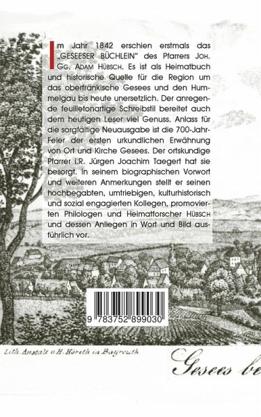 Das 1842 erstmals erschienene GESEESER BÜCHLEIN des Pfarrers JOH. GG. ADAM HÜBSCH ist als Heimatbuch und historische Quelle für die Region des Hummelgaues um das oberfränkische Gesees bis heute unersetzlich. Der unterhaltsame feuilletonartige Schreibstil bereitet auch dem Nichtfachmann Genuss. Man spürt: Der einstige Verfasser ist in diese Landschaft und ihre Menschen verliebt und begegnet ihnen mit Achtung. Der Großdruck führt zu guter Lesbarkeit. Einen historischen Versuch - so nannte der damalige Geseeser Geistliche bescheiden sein im Selbstverlag erschienenes Taschenbüchlein. Es blieb bis heute das einzige geschlossene Werk zur Orts- und Kirchengeschichte der Region um GESEES und wird von Kennern immer noch gern als kompetente Quelle zitiert. Schon dieses Alleinstellungsmerkmal wäre ein Grund zur Neuausgabe, die hier zusammen mit der Gemeinde GESEES gewagt wird. Das Büchlein erscheint nun anlässlich der 700-Jahr-Feier der ersten urkundlichen Erwähnung von Ort und Kirche. HÜBSCH lädt den Leser ein, den Blick auf die menschenfreundliche Ausstrahlung der gut 20 Dörfer, Weiler und Einöden zu richten, die ihren geistlichen und räumlichen Mittelpunkt im weithin sichtbaren Wehrkirchen-Ensemble ST. MARIEN ZUM GESEES haben. Er beschreibt kurzweilig die Geschichte und Kultur dieser Landschaft des Hummelgaues, die trotz ihrer Nähe zur quirligen Bezirkshauptstadt BAYREUTH und trotz mancher Zuwanderung in sich selbst ruht.In einem kenntnisreichen biographischen Vorwort stellt der Neuherausgeber Jürgen Joachim Taegert seinen Kollegen Pfarrer HÜBSCH als hochbegabten, umtriebigen, kulturhistorisch und sozial engagierten Theologen, promovierten Philologen und Heimatforscher in Wort und Bild persönlich vor und informiert in vertiefenden Exkursen über das Besondere seines Anliegens. Denn erstaunlicherweise erfährt man in der sonst allwissenden gemeinnützigen Enzyklopädie Wikipedia über Pfarrer Hübsch bislang noch gar nichts und auch auf anderen Internetseiten nur sehr wenig. Auch seine Evang.-Luth. Landeskirche in Bayern hat ihn für ihre Geschichtsschreibung noch nicht entdeckt. Dabei wirkte Hübsch seelsorgerlich-aufklärend und sozial-nachhaltig in einer sehr markanten und bedrängenden Phase der Kirchwerdung im Bayerischen Königreich. Hübschs geschichtspädagogisches Wirken in Gesees und sein nachfolgendes, für ganz Oberfranken bis heute wirksames diakonisches Engagement insbesondere in Naila machen ihn zu einer ganz markanten Persönlichkeit des 19. Jahrhundert.