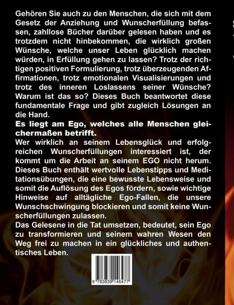 Gehören Sie auch zu den Menschen, die sich mit dem Gesetz der Anziehung und Wunscherfüllung befassen, zahllose Bücher darüber gelesen haben und es trotzdem nicht hinbekommen, die wirklich großen Wünsche, welche unser Leben glücklich machen würden, in Erfüllung gehen lassen? Trotz der richtigen positiven Formulierung, trotz überzeugenden Affirmationen, trotz emotionalen Visualisierungen und trotz des inneren Loslassens seiner Wünsche? Warum ist das so? Dieses Buch beantwortet diese fundamentale Frage und gibt zugleich Lösungen an die Hand.Es liegt am Ego, welches alle Menschen gleichermaßen betrifft.Wer wirklich an seinem Lebensglück und erfolgreichen Wunscherfüllungen interessiert ist, der kommt um die Arbeit an seinem EGO nicht herum. Dieses Buch enthält wertvolle Lebenstipps und Meditationsübungen, die eine bewusste Lebensweise und somit die Auflösung des Egos fördern, sowie wichtige Hinweise auf alltägliche Ego-Fallen, die unsere Wunschschwingung blockieren und somit keine Wunscherfüllungen zulassen.Das Gelesene in die Tat umsetzen, bedeutet, sein Ego zu transformieren und seinem wahren Wesen den Weg frei zu machen in ein glückliches und authentisches Leben.