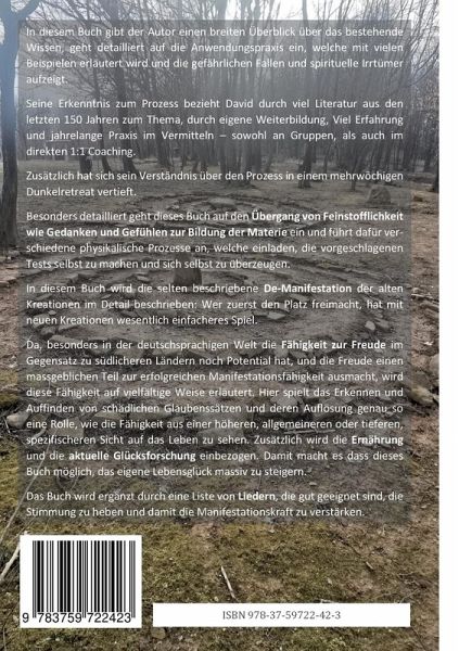 In diesem Buch gibt der Autor einen breiten Überblick über das bestehende Wissen, geht detailliert auf die Anwendungspraxis ein, welche mit vielen Beispielen erläutert wird und die gefährliche Fallen und spirituelle Irrtümer aufzeigt. Seine Erkenntnis zum Prozess bezieht David durch Literatur der letzten 150 Jahre zum Thema, durch eigene Weiterbildung und jahrelange Praxis im Vermitteln - sowohl an Gruppen, als auch im direkten 1:1 Coaching. Zusätzlich hat sich sein Verständnis über den Prozess in einem mehrwöchigen Dunkelretreat vertieft.Besonders detailliert geht dieses Buch auf den Übergang von Feinstofflichkeit wie Gedanken und Gefühlen zur Bildung der Materie ein und führt dafür verschiedene physikalische Prozesse an, welche einladen, die vorgeschlagenen Tests selbst zu machen und sich selbst zu überzeugen. In diesem Buch wird die selten beschriebene De-Manifestation der alten Kreationen im Detail beschrieben: Wer zuerst den Platz freimacht, hat mit neuen Kreationen wesentlich einfacheres Spiel. Da, besonders in der deutschsprachigen Welt die Fähigkeit zur Freude im Gegensatz zu südlicheren Ländern nicht sehr ausgeprägt ist, und die Freude einen massgeblichen Teil zur erfolgreichen Manifestationsfähigkeit ausmacht, wird diese Fähigkeit auf vielfältige Weise erläutert. Hier spielt das Erkennen und Auffinden von schädlichen Glaubenssätzen und deren Auflösung genau so eine Rolle, wie die Fähigkeit aus einer höheren, allgemeineren oder tieferen, spezifischeren Sicht auf das Leben zu sehen. Zusätzlich wird die Ernährung und die aktuelle Glücksforschung einbezogen. Damit macht es dass dieses Buch möglich, das eigene Lebensglück massiv zu steigern. Das Buch wird ergänzt durch eine Liste von Liedern, die gut geeignet sind, die Stimmung zu heben und damit die Manifestationskraft zu verstärken.