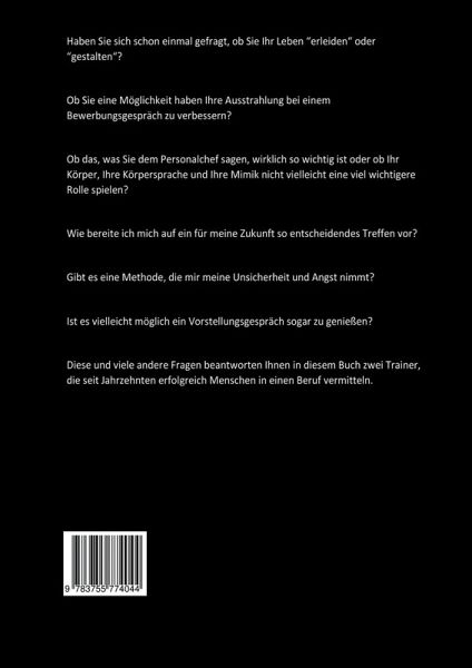 Haben Sie sich schon einmal gefragt, warum Sie immer wieder eingeladen werden, aber bis jetzt immer noch ohne Job sind?Ja? Dann sollten Sie unbedingt die Tipps unserer beiden bekannten Bewerbungscoaches Tanja Winterhalter und Arno Meier lesen!Ruhig, sachlich und humorvoll werden Sie durch dieses Buch an die "Geheimnisse" eines guten Vorstellungsgespräches herangeführt. 30 Jahre haben die Beiden entsprechende Erfahrungen gesammelt, Kurse gegeben und dabei hunderte von Teilnehmern in Arbeit gebracht.Profitieren auch Sie von diesem reichhaltigen Erfahrungsschatz und lassen Sie Ihr nächstes Bewerbungsgespräch endlich einmal "erfolgreich" sein!