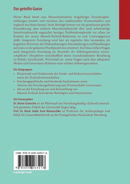 Dieser Band bietet eine Momentaufnahme langjähriger Forschungsbemühungen jenseits und zwischen den traditionellen Wissenschaften und zugleich aus ihnen heraus. Seine Beiträge kreisen um die gemeinsam geteilte Einschätzung, dass isolierte Monodisziplinarität aber auch arbeitsteilige Interdisziplinarität angesichts heutiger Problemkomplexität vor allem im Kontext der neuen Mensch-Technik-Relationen an eine Leistungsgrenze stößt. Integrierte Forschung wird hier als regulative Idee verstanden, als kognitiver Horizont, der Wahrnehmungen, Entscheidungen und Handlungen auf einen in ihr gefassten Fluchtpunkt hin orientiert. Im Fokus stehen Fragen nach Integrierter Forschung als Ensemble der Selbstorganisation wissenschaftlicher Disziplinen einschließlich deren transdisziplinärer Beziehung zu Politik, Gesellschaft, Wirtschaft etc. sowie Fragen nach dem adäquaten Modus und Governance-Rahmen einer solchen Selbstorganisation.