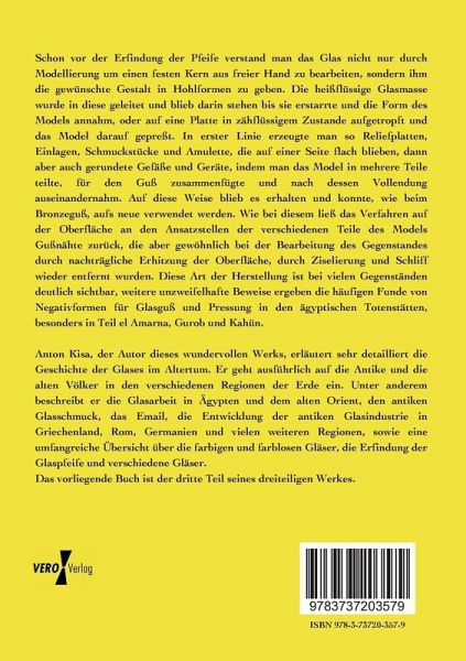 Anton Kisa, der Autor dieses wundervollen Werks, erläutert sehr detailliert die Geschichte der Glases im Altertum. Er geht ausführlich auf die Antike und die alten Völker in den verschiedenen Regionen der Erde ein. Unter anderem beschreibt er die Glasarbeit in Ägypten und dem alten Orient, den antiken Glasschmuck, das Email, die Entwicklung der antiken Glasindustrie in Griechenland, Rom, Germanien und vielen weiteren Regionen, sowie eine umfangreiche Übersicht über die farbigen und farblosen Gläser, die Erfindung der Glaspfeife und verschiedene Gläser.