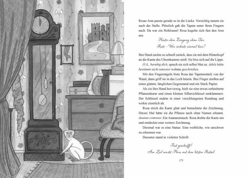 Verschiedene Rätsel, exotische Pflanzen, Antiquitäten, Trauer, Neid und ein Familiengeheimnis. Das Buch hat viel zu bieten. So wundert es nicht, dass es spannend zugeht und auch das Miträtseln nicht zu kurz kommt. Alle Charaktere sind bildhaft beschrieben, so dass es mir leichtfiel, sie mir vorzustellen und mich in sie hineinzuversetzen. Mit dem Äffchen Uma ist dann auch mal ein anderes Tier Teil der Story und sie macht alles ein bisschen lebendiger und lustiger. Der Schreibstil ist detailliert, bunt und lebhaft, sehr gut zu lesen und schön kindgerecht. Die vielen s/w-Zeichnungen, die übrigens von der Autorin selbst stammen, sind super gelungen und lockern die Kapitel schön auf. Mir gefällt auch die „Geschichte in der Geschichte“, also der Teil, wo es um Adeles Vergangenheit geht, richtig gut. Es gab einige Wendungen und Unvorhersehbares, vor allem zum Ende hin. Die Rätsel sind für den Leser schwer zu knacken, machen aber Spaß. Der Titel spricht ja von einem Glashaus und ich habe mich immer wieder gefragt, was es damit wohl auf sich hat. Die Antwort auf diese Frage bekam ich – wenn auch erst sehr spät im Buch, was mich aber nicht störte.