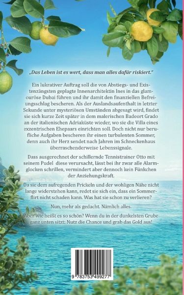 Ein lukrativer Auftrag soll die von Abstiegsängsten geplagte Innenarchitektin Ines in das glamouröse Dubai führen. Als der Auslandsaufenthalt in letzter Sekunde unter mysteriösen Umständen abgesagt wird, findet sie sich kurze Zeit später in dem malerischen Badeort Grado an der italienischen Adriaküste wieder, wo sie die Villa eines exzentrischen Ehepaars einrichten soll. Doch nicht nur berufliche Aufgaben bescheren ihr einen turbulenten Sommer, denn auch ihr Herz sendet nach Jahren im Schneckenhaus überraschenderweise Lebenssignale. Dass ausgerechnet der schillernde Tennistrainer Otto mit seinem Pudel Zorro diese verursacht, lässt bei ihr zwar alle Alarmglocken schrillen, vermindert aber dennoch kein Fünkchen der Anziehungskraft.Da sie dem aufregenden Prickeln und der wohligen Nähe nicht lange widerstehen kann, redet sie sich ein, dass ein Sommerflirt nicht schaden kann. Was hat sie schon zu verlieren?Nun, mehr als gedacht. Nämlich alles.Aber wie heißt es so schön? Wenn du in der dunkelsten Grube ganz unten sitzt: Nutz die Chance und grab das Gold aus!