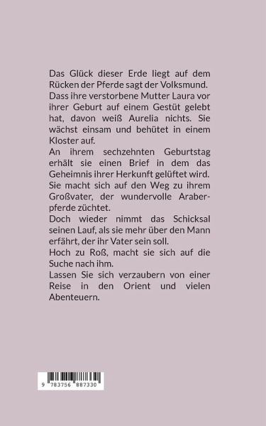 Das Glück dieser Erde liegt auf dem Rücken der Pferde sagt der Volksmund.Dass ihre verstorbene Mutter Laura vor ihrer Geburt auf einem Gestüt gelebt hat, davon weiß Aurelia nichts. Sie wächst einsam und behütet in einem Kloster auf.An ihrem sechzehnten Geburtstag erhält sie einen Brief in dem das Geheimnis ihrer Herkunft gelüftet wird.Sie macht sich auf den Weg zu ihrem Großvater, der wundervolle Araberpferde züchtet.Doch wieder nimmt das Schicksal seinen Lauf, als sie mehr über den Mann erfährt, der ihr Vater sein soll.Hoch zu Roß, macht sie sich auf die Suche nach ihm. Lassen Sie sich verzaubern von einer Reise in den Orient und vielen Abenteuern.