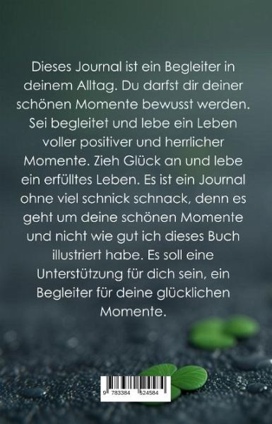 Wenn ich mich auf glückliche «Zufälle» im Alltag fokussiere und diese bewusst wahrnehme, so werde ich merken, dass diese wunderbaren Ereignisse sich häufen und immer mehr in mein Leben treten.Dieses Journal soll dir helfen, dich auf die wunderbaren und schönen Momente deines Alltags zu fokussieren und diese bewusst zu erkennen. Vielleicht ist es am Anfang ein bisschen schwer, eine ganze Seite auszufüllen, du wirst merken, es geht von Tag zu Tag leichter. Dieses Journal ist für ein Jahr ausgelegt. Das heisst du füllst jeden Tag eine Seite aus und hast am Schluss ein Tagebuch voller schöner Momente eines ganzen Jahres. Es ist ein Journal ohne viel schnick schnack, denn es geht um deine schönen Momente und nicht wie gut ich dieses Buch illustriert habe. Es soll eine Unterstützung für dich sein, ein Begleiter für deine glücklichen Momente.Zwischendurch findest du Hinweise oder Gedanken, welche dich im Finden deiner schönen Momente unterstützen sollen. Es sind Gedanken und zum Teil Aufforderungen, bitte bedenke, dass ich vieles mit einem Augenzwinkern geschrieben habe.