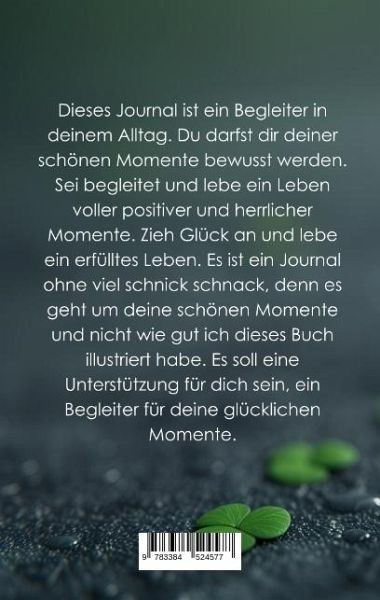 Wenn ich mich auf glückliche «Zufälle» im Alltag fokussiere und diese bewusst wahrnehme, so werde ich merken, dass diese wunderbaren Ereignisse sich häufen und immer mehr in mein Leben treten.Dieses Journal soll dir helfen, dich auf die wunderbaren und schönen Momente deines Alltags zu fokussieren und diese bewusst zu erkennen. Vielleicht ist es am Anfang ein bisschen schwer, eine ganze Seite auszufüllen, du wirst merken, es geht von Tag zu Tag leichter. Dieses Journal ist für ein Jahr ausgelegt. Das heisst du füllst jeden Tag eine Seite aus und hast am Schluss ein Tagebuch voller schöner Momente eines ganzen Jahres. Es ist ein Journal ohne viel schnick schnack, denn es geht um deine schönen Momente und nicht wie gut ich dieses Buch illustriert habe. Es soll eine Unterstützung für dich sein, ein Begleiter für deine glücklichen Momente.Zwischendurch findest du Hinweise oder Gedanken, welche dich im Finden deiner schönen Momente unterstützen sollen. Es sind Gedanken und zum Teil Aufforderungen, bitte bedenke, dass ich vieles mit einem Augenzwinkern geschrieben habe.