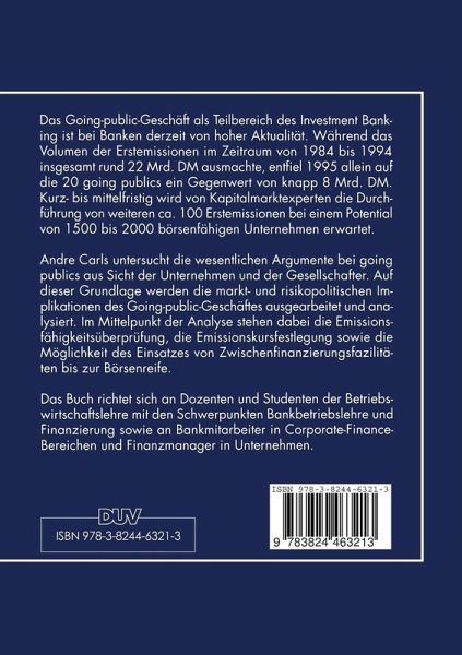 Das Going-public-Geschäft als Teilbereich des Investment Banking ist bei Banken derzeit von hoher Aktualität. Während das Volumen der Erstemissionen im Zeitraum von 1984 bis 1994 insgesamt rund 22 Mrd. DM ausmachte, entfiel 1995 allein auf die 20 going publics ein Gegenwert von knapp 8 Mrd. DM. Kurz- bis mittelfristig wird von Kapitalmarktexperten die Durchführung von weiteren ca. 100 Erstemissionen bei einem Potential von 1500 bis 2000 börsenfähigen Unternehmen erwartet. Andre Carls untersucht die wesentlichen Argumente bei going publics aus Sicht der Unternehmen und der Gesellschafter. Auf dieser Grundlage werden die markt- und risikopolitischen Implikationen des Going-public-Geschäftes ausgearbeitet und analysiert. Im Mittelpunkt der Analyse stehen dabei die Emissionsfähigkeitsüberprüfung, die Emissionskursfestlegung sowie die Möglichkeit des Einsatzes von Zwischenfinanzierungsfazilitäten bis zur Börsenreife.