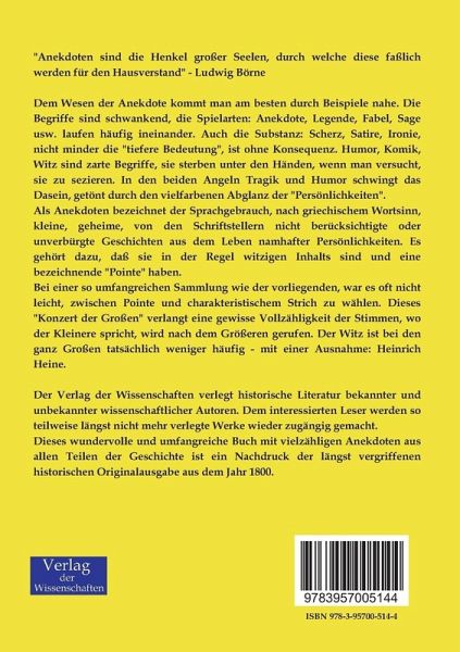 Dieses wundervolle und umfangreiche Buch mit vielzähligen Anekdoten aus allen Teilen der Geschichte ist ein Nachdruck der längst vergriffenen historischen Originalausgabe aus dem Jahr 1800.