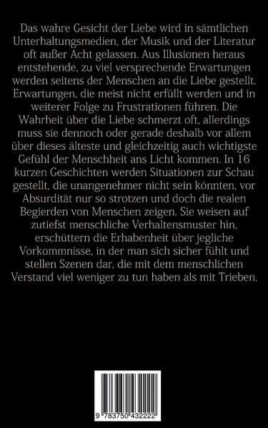 Das wahre Gesicht der Liebe wird in sämtlichen Unterhaltungsmedien, der Musik und der Literatur oft außer Acht gelassen. Liebeskummer ist für viele Menschen eine weit schmerzhaftere Empfindung als jede Krankheit und jede Kränkung, die sie überstehen und verkraften müssen. Aus Illusionen heraus entstehende, zu viel versprechende Erwartungen werden seitens der Menschen an die Liebe gestellt. Erwartungen, die meist nicht erfüllt werden und in weiterer Folge zu Frustrationen führen. Die Wahrheit über die Liebe schmerzt oft, allerdings muss sie dennoch oder gerade deshalb vor allem über dieses älteste und gleichzeitig auch wichtigste Gefühl der Menschheit ans Licht kommen. Mit 16 kurzen Geschichten werden in diesem Buch Situationen zur Schau gestellt, die unangenehmer nicht sein könnten, vor Absurdität nur so strotzen und doch die wahren Begierden von Menschen zeigen, derer man sich oft gar nicht erst bewusst sein möchte. Sie weisen auf zutiefst menschliche Verhaltensmuster hin, erschüttern die Erhabenheit über jegliche Vorkommnisse, in der man sich sicher fühlt und stellen Szenen dar, die mit dem menschlichen Verstand viel weniger zu tun haben als mit Trieben.Ob es nun der bloße Wunsch nach einer Veränderung, die Realität gewordene Affäre oder aber die Liebe zu einer angebeteten Person wie einer bekannten Persönlichkeit ist. Nichts wird in diesem Buch beschönigt. Vermeintliche gesellschaftliche Tabus werden von den Protagonisten teils gebrochen ohne mit der Wimper zu zucken und die Würde der Menschen erbarmungslos auf ein Maß herabgesetzt, das in vielen Fällen auch in der Wirklichkeit ertragen werden muss.Der tragische Ausgang von Liebesgeschichten und solchen, die es noch gar nicht geworden sind, zeigt sich in bitteren Schicksalsschlägen, sinnentleerten letzten Auswegen und gestörten beziehungsweise verstörenden Wahrnehmungen. Nicht nur das klassische Bild von Eheleuten, Einzelkämpfern und Blendern wird aufgegriffen, sondern auch das sensible Gefühlsleben zwischen Teenagern, Verwandten und Unbekannten.Die Liebe, ein Spiel, das man gewinnen kann, meist jedoch verliert