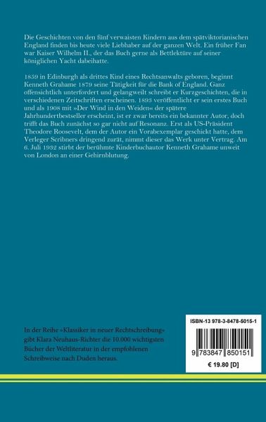 In der Reihe »Klassiker in neuer Rechtschreibung« gibt Klara Neuhaus-Richter die wichtigsten Bücher der Weltliteratur in der empfohlenen Schreibweise nach Duden heraus. Kenneth Grahame: Das goldene Zeitalter. Erinnerungen an die Kindheit Die Geschichten von den fünf verwaisten Kindern aus dem spätviktorianischen England finden bis heute viele Liebhaber auf der ganzen Welt. Ein früher Fan war Kaiser Wilhelm II., der das Buch gerne als Bettlektüre auf seiner königlichen Yacht dabeihatte. »The Golden Age«. Erstdruck: London, The Bodley Head, 1895. Hier in der Übersetzung von Emmy Becher, Stuttgart, Engelhorn, 1900 in der Reihe »Engelhorns Allgemeine Romanbibliothek. Eine Auswahl der besten modernen Romane aller Völker«, 16. Jahrgang, Band 23. Neu herausgegeben von Klara Neuhaus-Richter, Berlin 2021. Umschlaggestaltung von Rainer Richter unter Verwendung einer Porträtzeichnung von Josefine Weinschrott. Gesetzt aus der Minion Pro, 11 pt. Henricus - Edition Deutsche Klassik GmbH Über den Autor: 1859 in Edinburgh als drittes Kind eines Rechtsanwalts geboren, beginnt Kenneth Grahame 1879 seine Tätigkeit für die Bank of England. Ganz offensichtlich unterfordert und gelangweilt schreibt er Kurzgeschichten, die in verschiedenen Zeitschriften erscheinen. 1893 veröffentlicht er sein erstes Buch und als 1908 mit »Der Wind in den Weiden« der spätere Jahrhundertbestseller erscheint, ist er zwar bereits ein bekannter Autor, doch trifft das Buch zunächst so gar nicht auf Resonanz. Erst als US-Präsident Theodore Roosevelt, dem der Autor ein Vorabexemplar geschickt hatte, dem Verleger Scribners dringend zurät, nimmt dieser das Werk unter Vertrag. Am 6. Juli 1932 stirbt der berühmte Kinderbuchautor Kenneth Grahame unweit von London an einer Gehirnblutung.